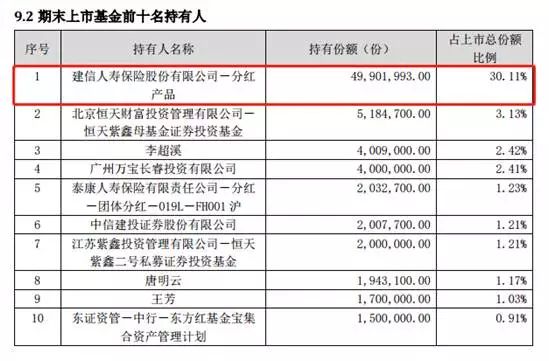 根据银行ETF的2017年报数据披露,该只基金机构持有人占比达到45.94%,在2017年公布的前十大机构持有人中,建信人寿保险股份有限公司、中信建投证券股份有限公司、东证资管-东方红基金宝集合资产管理计划等保险、券商、公募专户等多类型机构投资者在列。其中,建信人寿保险股份有限公司的分红产品,单个机构持有人持有份额就达到499.02万份,占上市总份额比重高达30.11%。