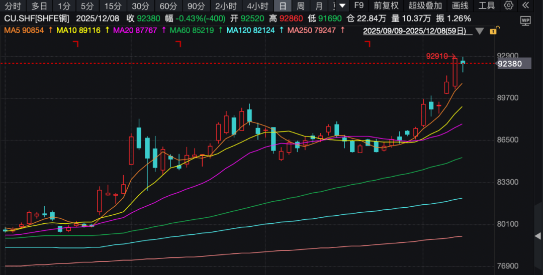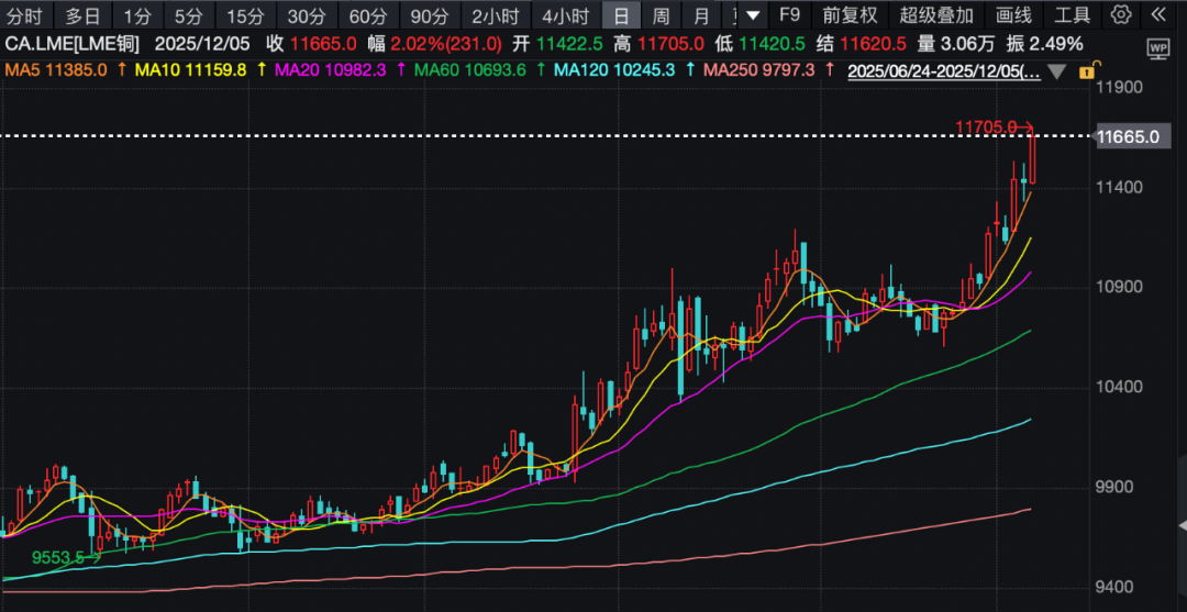 近期铜价暴涨。伦敦铜期货价格周五(12月5日)再涨2%,报收11665美元/吨。国内沪铜主力合约周五盘中直奔93000元关口。