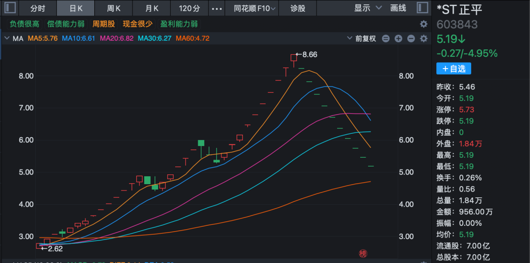 12月16日,绩差问题股领跌,23家主板ST股跌停。其中,*ST正平(603843)连续10个交易日跌停,*ST返利(600228)录得九连板跌停。*ST长药(300391)收盘下跌9.19%,最新收盘价1.68元/股,创下历史新低,最新A股市值已不到6亿元,公司今年前三季度净利润亏损2.1亿元。