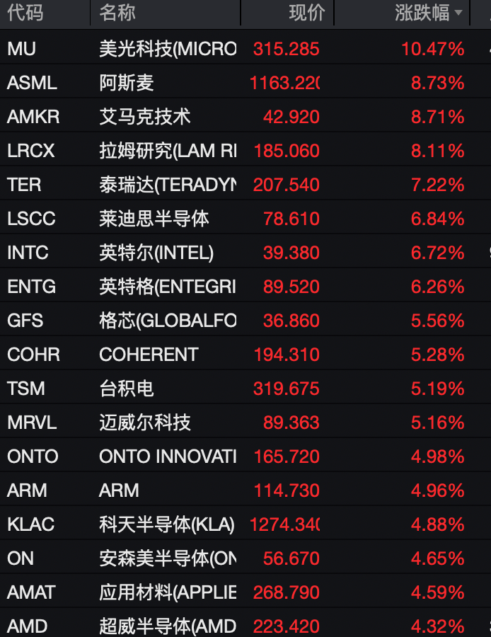 芯片股集体大涨,费城半导体指数大涨超4%。个股方面,美光科技涨超10%,阿斯麦、拉姆研究等涨超8%,英特尔涨超6%,台积电、迈威尔科技等涨超5%,科天半导体、ARM、超威半导体等涨超4%。