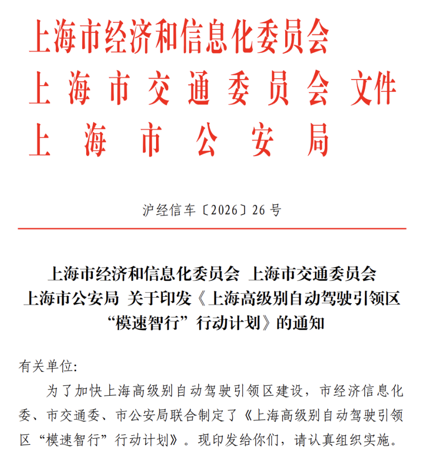 1月14日消息,上海市经济和信息化委员会、上海市交通委员会、上海市公安局印发《上海高级别自动驾驶引领区 “模速智行”行动计划》(以下简称《行动计划》),其中提出,按照“模型驱动引领、应用示范带动、产业协同发展、政策举措支撑”的总体思路,推动自动驾驶技术创新向产业竞争力加速转化。