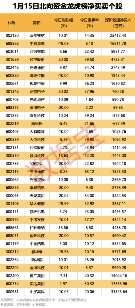 今日龙虎榜现身个股中,10股获北向资金净买入。净买入居首的是沃尔核材,金额为2.54亿元。中科星图、合锻智能和矽电股份等紧随其后,净买入金额均超4000万元。