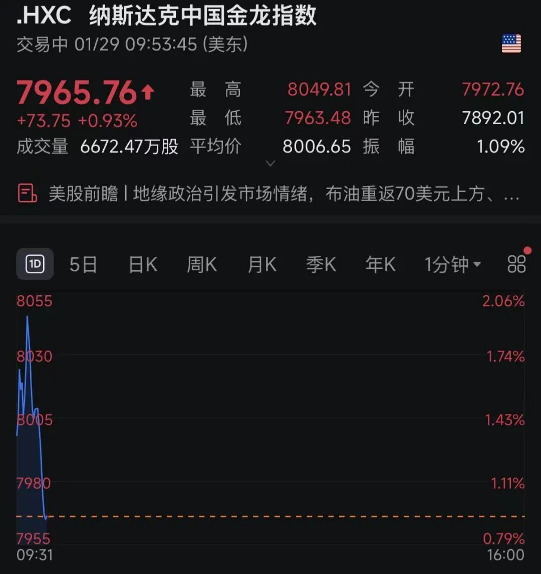 中概股则直线爆发,纳斯达克中国金龙指数开盘走高,截至发稿涨逾0.9%,个股方面,蔚来涨超8%,小牛电动涨逾5%。