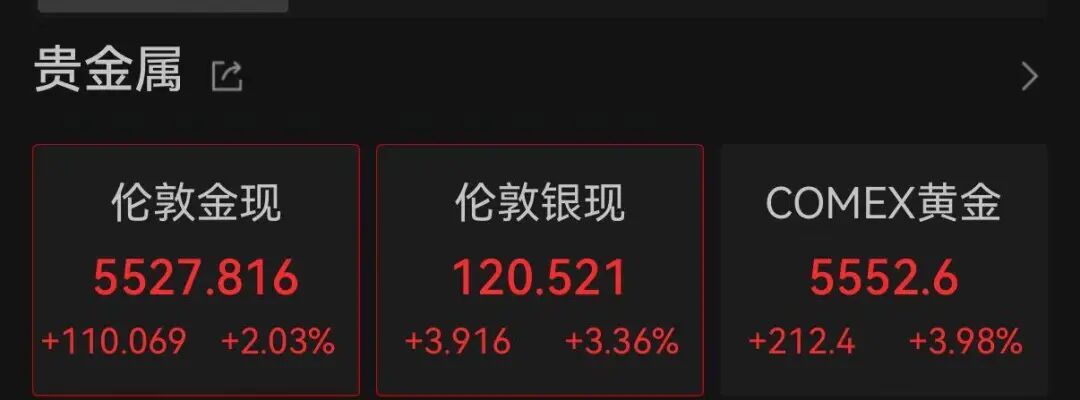 黄金和白银则继续表现强势,黄金仍保持在5500美元上方,今日一度冲击5600美元,白银盘中突破121美元关口,再度创下历史新高。