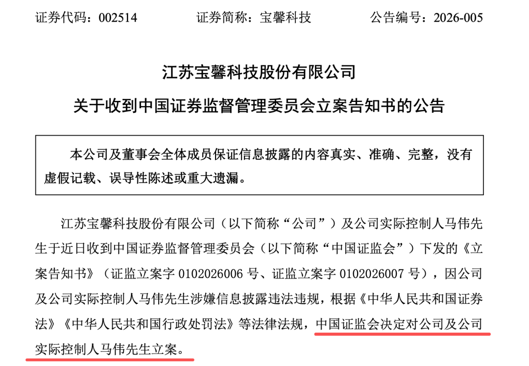 宝馨科技(002514)1月30日晚间公告,公司及实控人马伟于近日收到证监会下发的《立案告知书》,因公司及马伟涉嫌信息披露违法违规,根据相关法律法规,证监会决定对公司及马伟立案。