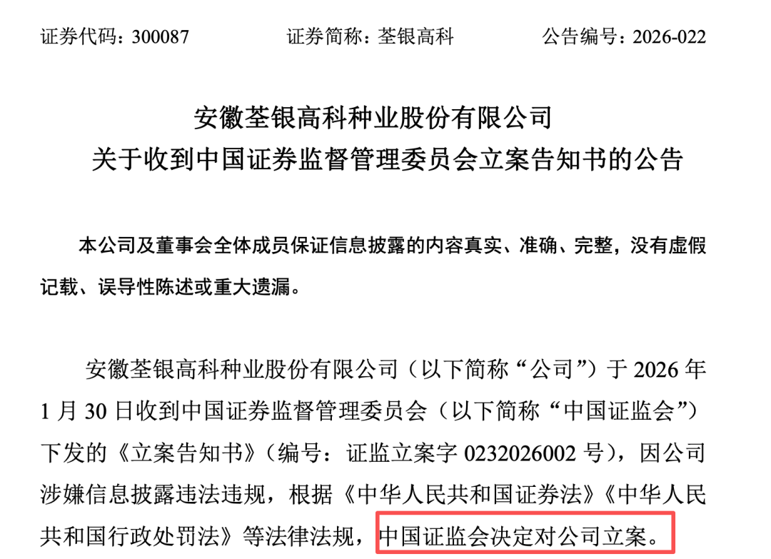 荃银高科(300087)公告称,公司于1月30日收到中国证监会下发的《立案告知书》,因公司涉嫌信息披露违法违规,中国证监会决定对公司立案。