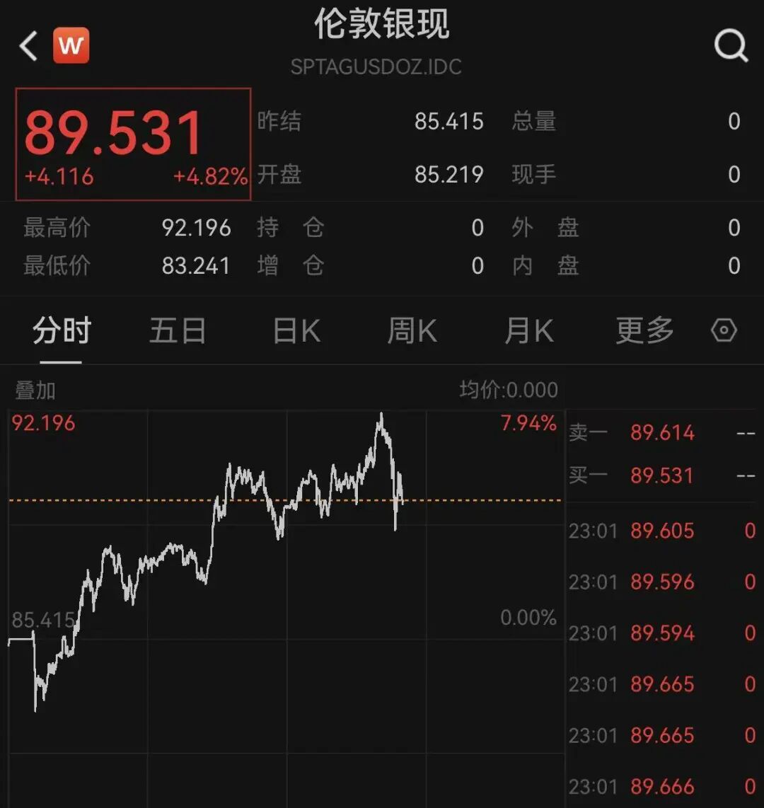 白银则在一度涨至92美元,目前回调,仍保持在90美元下方。