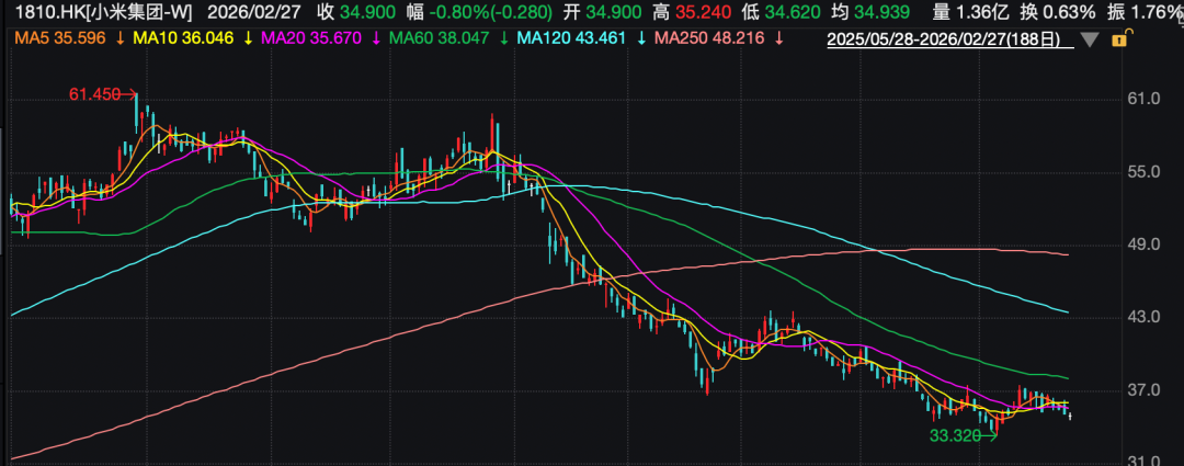 不过,随着销量上升,小米汽车亦有多起事故曾引发市场广泛关注。资本市场方面,小米集团股价自去年中旬创下61.45港元/股的新高以来,整体呈现持续走低态势,最低一度至33.32港元/股,较高点接近腰斩。