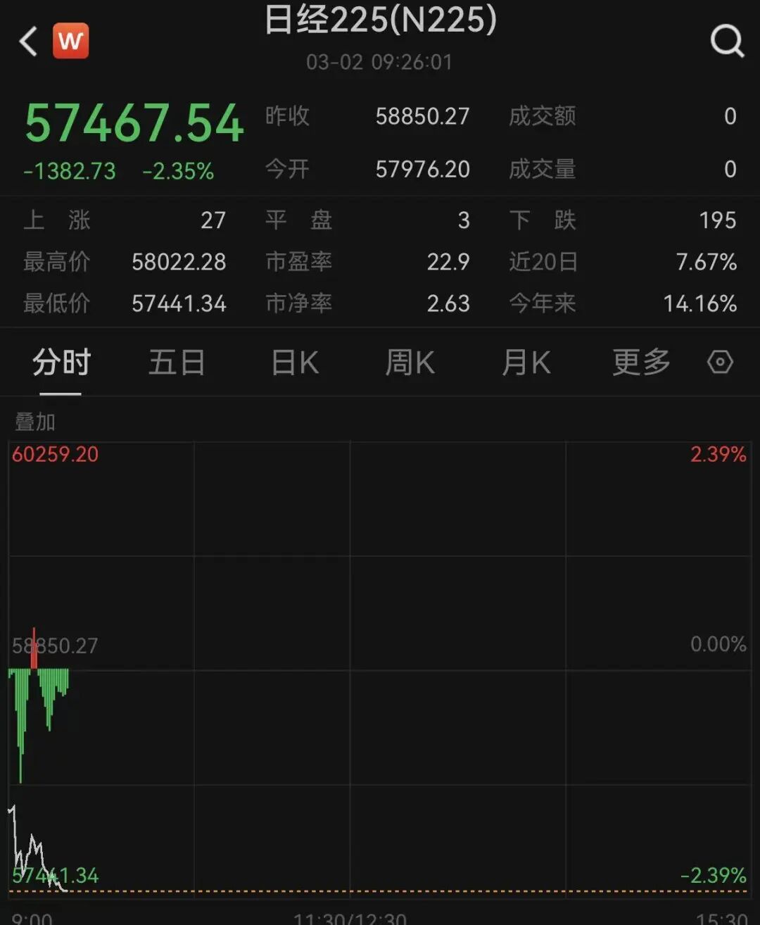 亚太市场方面,率先开盘的日股开盘大跌,截至发稿,日经225指数跌超2%,跌超1300点,东证指数跌逾2.5%。
