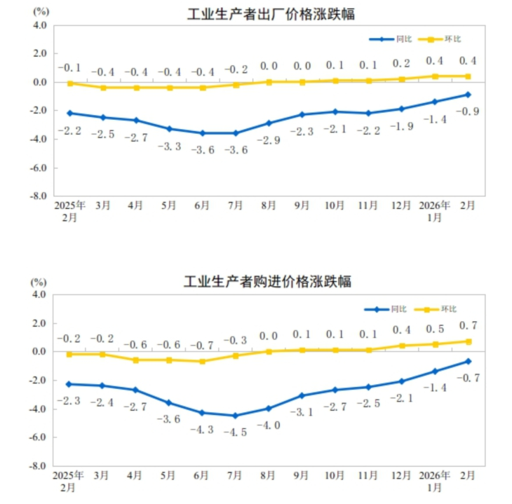 人民财讯3月9日电,据国家统计局,2026年2月份,全国工业生产者出厂价格同比下降0.9%,降幅比上月收窄0.5个百分点;环比上涨0.4%,涨幅与上月相同。工业生产者购进价格同比下降0.7%,降幅比上月收窄0.7个百分点;环比上涨0.7%,涨幅比上月扩大0.2个百分点。1—2月平均,工业生产者出厂价格比上年同期下降1.2%,工业生产者购进价格下降1.1%。