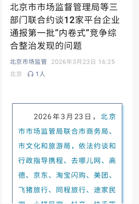 据北京市场监管官微消息,3月23日,北京市市场监管局联合市商务局、市文化和旅游局,依法约谈和行政指导携程、去哪儿网、高德、京东、淘宝闪购、美团、飞猪旅行、同程旅行、途家民宿、小猪民宿、抖音、快手等十二家平台企业,集中通报开展平台“内卷式”竞争综合整治以来发现的第一批问题,并提出整改要求。