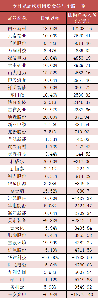 盘后龙虎榜数据显示,机构现身多股,其中南亚新材等股票呈现机构资金净买入,三安光电等股票呈现机构资金净卖出。