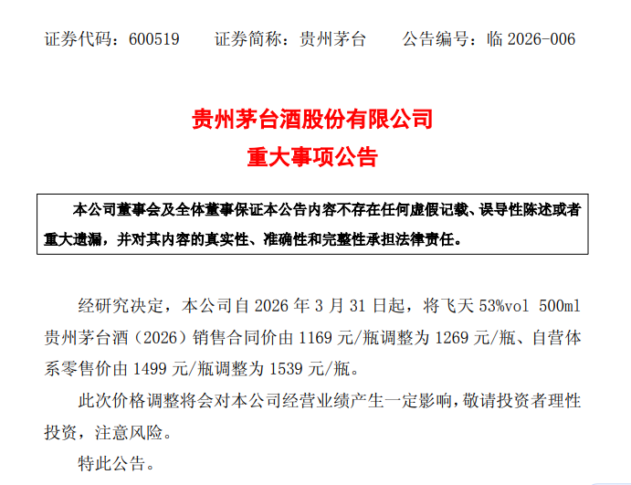 贵州茅台(600519)3月30日公告,经研究决定,公司自2026年3月31日起,将飞天53%vol 500ml贵州茅台酒(2026)销售合同价由1169元/瓶调整为1269元/瓶、自营体系零售价由1499元/瓶调整为1539元/瓶。此次价格调整将会对本公司经营业绩产生一定影响,敬请投资者理性投资,注意风险。
