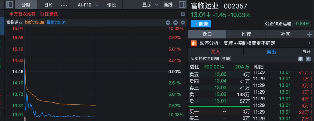 4月2日,富临运业(002357)复牌跌停,最新股价为13.01元/股。