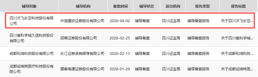据证监会网站披露,四川沃飞长空科技股份有限公司(下称“沃飞长空”)于2026年4月2日在四川证监局办理辅导备案登记,拟首次公开发行股票并科创板上市,辅导机构为中信建投证券,会计师事务所为天健会计师事务所(特殊普通合伙)。