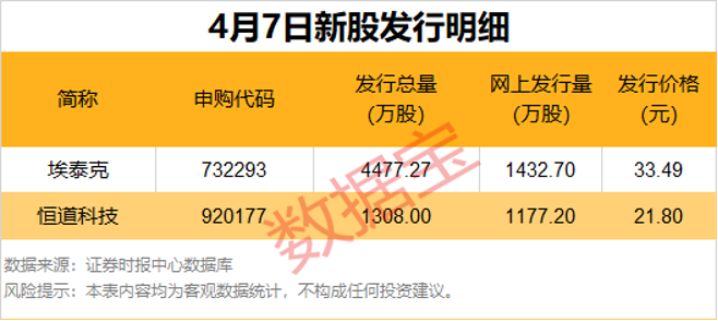今日共有2只新股申购,分别为沪市主板的埃泰克,北交所的恒道科技。