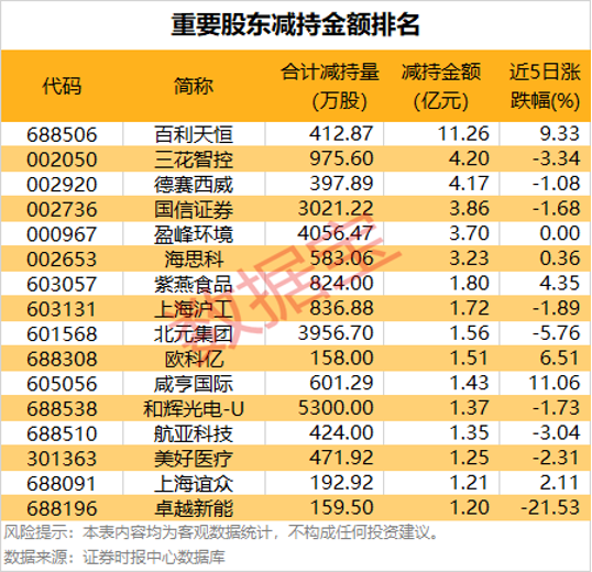 从金额看,减持金额在1亿元以上的有16家,减持金额最多的是百利天恒,其间累计减持412.87万股,减持金额合计11.26亿元。