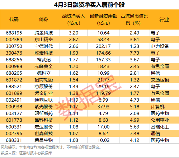 具体到个股,4月3日共有1115股获融资净买入,净买入金额在千万元以上的有213股,其中17股融资净买入额均超1亿元。