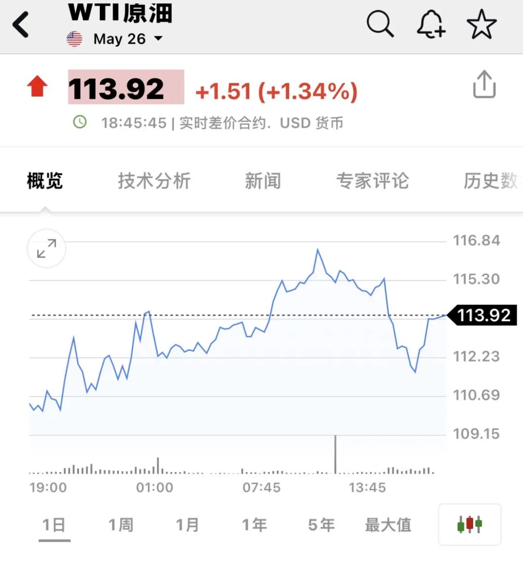 WTI原油小幅拉升,现涨超1%,报113.92美元/桶。