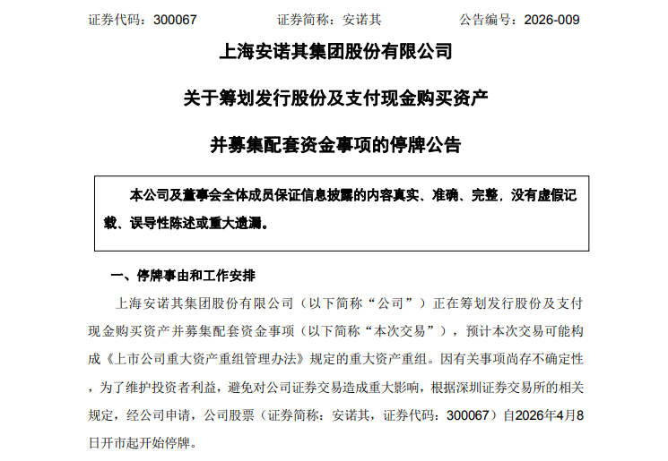 4月7日晚间,安诺其(300067)发布公告称,公司正在筹划发行股份及支付现金购买资产并募集配套资金事项,拟由公司通过发行股份及支付现金的方式购买标的公司广州烽云信息科技有限公司(以下简称“广州烽云”)控制权,并募集配套资金。