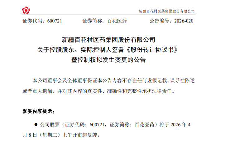百花医药(600721)4月7日晚间发布控制权变更公告,公司控股股东、实控人米在齐、米恩华、杨小玲与金华市聚新企业管理合伙企业(有限合伙)签署《股份转让协议》,拟以8.9亿元总价转让公司20.68%股份。公司股票将于4月8日起复牌。