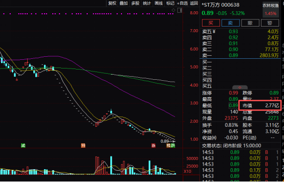 4月13日,主板A股公司*ST万方股价再度下跌,收报0.89元/股,总市值已仅约2.77亿元,这是公司总市值连续第20个交易日低于5亿元。