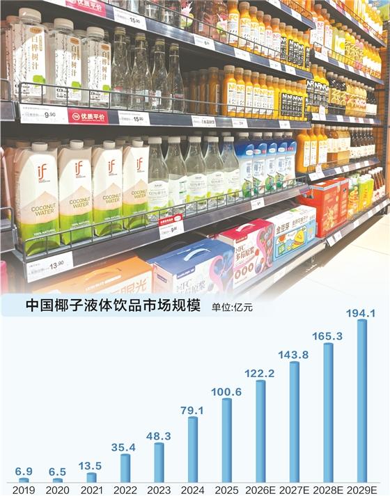 勤策消费研究报告显示,中国椰子液体饮品市场规模从2019年的6.9亿元起步,2024年飙升至79.1亿元,增长逾10倍;未来有望以年均20%以上的速度扩张,2029年市场规模或达到194亿元。2019年至2029年,行业复合年增长率约40%。
