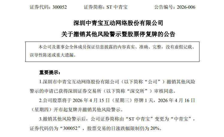 ST中青宝(300052)4月14日晚公告,公司撤销其他风险警示的申请已获得深交所审核同意,公司股票将于2026年4月15日(星期三)停牌1天,2026年4月16日(星期四)开市起复牌并撤销其他风险警示。撤销其他风险警示后,公司证券简称由“ST中青宝”变更为“中青宝”,证券代码保持不变,股票交易的日涨跌幅限制仍为20%。