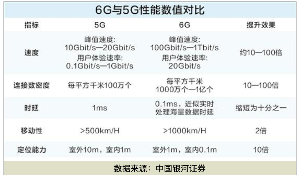 6G即第六代移动通信技术,是相对于当下已商用的5G的演进技术。6G传输速率相较5G提升10—100倍,达100Gbps(千兆比特每秒)以上,时延压缩至微秒级,连接数量上,可支持每平方公里千万级设备接入。