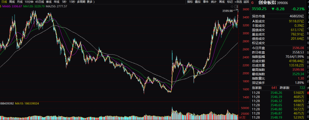 创业板指盘中一度进一步上行,上午最高达3599.98点,一度突破2021年7月22日的前期高点,创出2015年6月18日之后接近11年新高,后创业板指冲高回落并转跌,截至上午收盘,该指数跌0.23%。