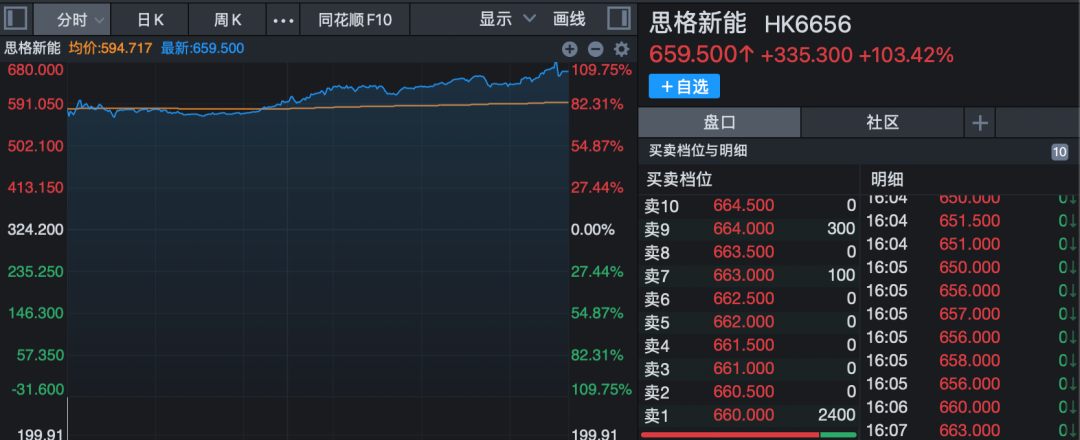 4月16日,多重热门概念傍身的思格新能(06656.HK)正式登陆港交所主板。上市首日,该股大涨103.42%,报659.5港元/股,市值超过1600亿港元。