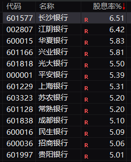 银行股股息率中值高达4.4%,远远超过1年期银行存款利率。长沙银行、江阴银行股息率均超过6%,华夏银行、兴业银行等11股股息率超5%。