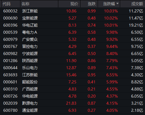 板块内个股中,浙江新能、宝新能源、华电辽能、粤电力A、广安爱众涨停,晋控电力逼近涨停,宁波能源涨超8%,陕西能源、乐山电力等涨超7%。