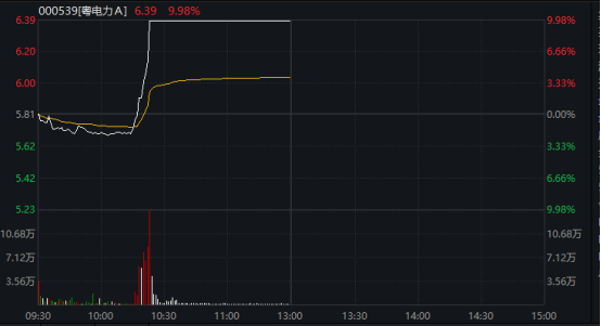其中,粤电力A、广安爱众盘中均呈现直线拉升走势,两股均在10分钟内拉升涨停。