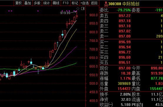 值得注意的是,中际旭创仍表现坚挺,股价再度攀升,盘中最高至919.99元/股,续创历史新高,市值一度突破万亿元大关,近一年以来该股累计涨幅已超1000%。