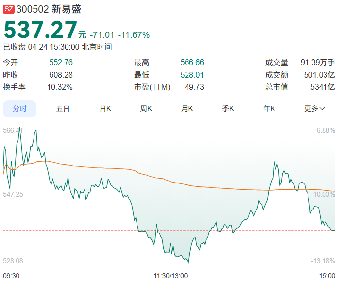 受一季报业绩不及预期影响,光通信龙头新易盛(300502)盘中放量大跌,收盘跌11.67%报537.27元/股。该股全日成交501亿元,位居A股成交额首位,创其上市以来单日成交额新高,同时成为A股历史上第4只单日成交额突破500亿元的个股。
