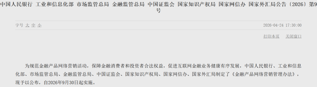 为规范金融产品网络营销活动,中国人民银行等八部门4月24日公布《金融产品网络营销管理办法》(下称《办法》),对金融机构开展金融产品网络营销,以及第三方互联网平台接受金融机构委托为金融产品网络营销提供服务的行为进行全面规范,自2026年9月30日起实施。