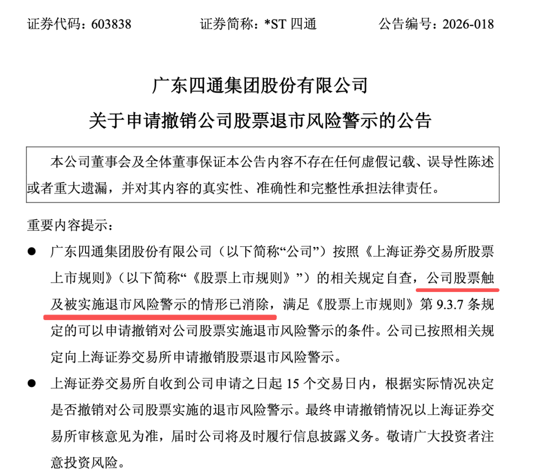 *ST四通4月27日公告,申请撤销公司股票退市风险警示。*ST四通表示,公司全体董事保证《2025年年度报告》内容的真实性、准确性、完整性。信永中和会计师事务所对公司2025年度财务报告及内部控制进行审计并出具了标准无保留意见的审计报告。