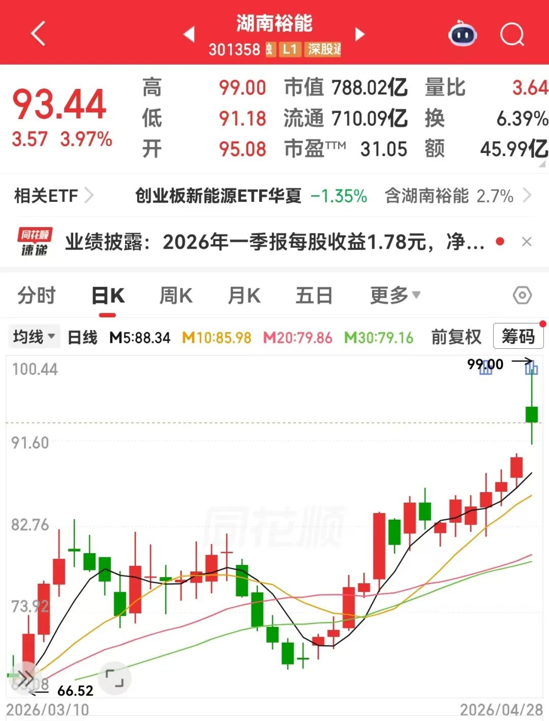 4月28日早盘,湖南裕能(301358)开盘上涨5.8%,盘中一度涨超10%,股价最高达到99元/股,创下历史新高。公司股价强势表现与一季报亮眼成绩不无关系。