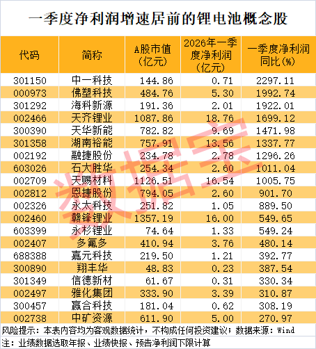 就在同一天,锂电池概念核心标的天齐锂业、天赐材料、永兴材料、融捷股份、新宙邦、嘉元科技均披露了一季报,且业绩同比翻倍或扭亏为盈。