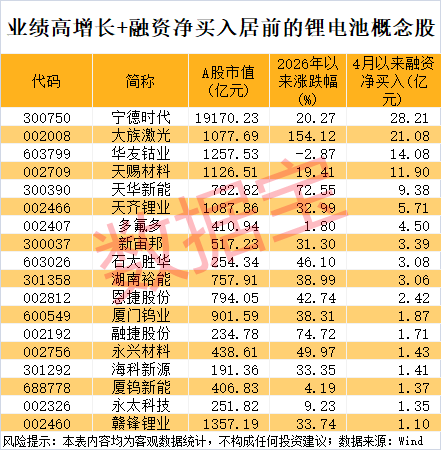 从资金流向来看,上述业绩高增长的锂电池概念股中,截至4月27日收盘,4月以来融资净买入超1亿元的有18只。4股融资净买入额逾10亿元,分别为宁德时代、大族激光、华友钴业、天赐材料。宁德时代4月以来融资净买入28.21亿元,居首。该公司今年一季度实现净利润207亿元,同比增长48.52%。