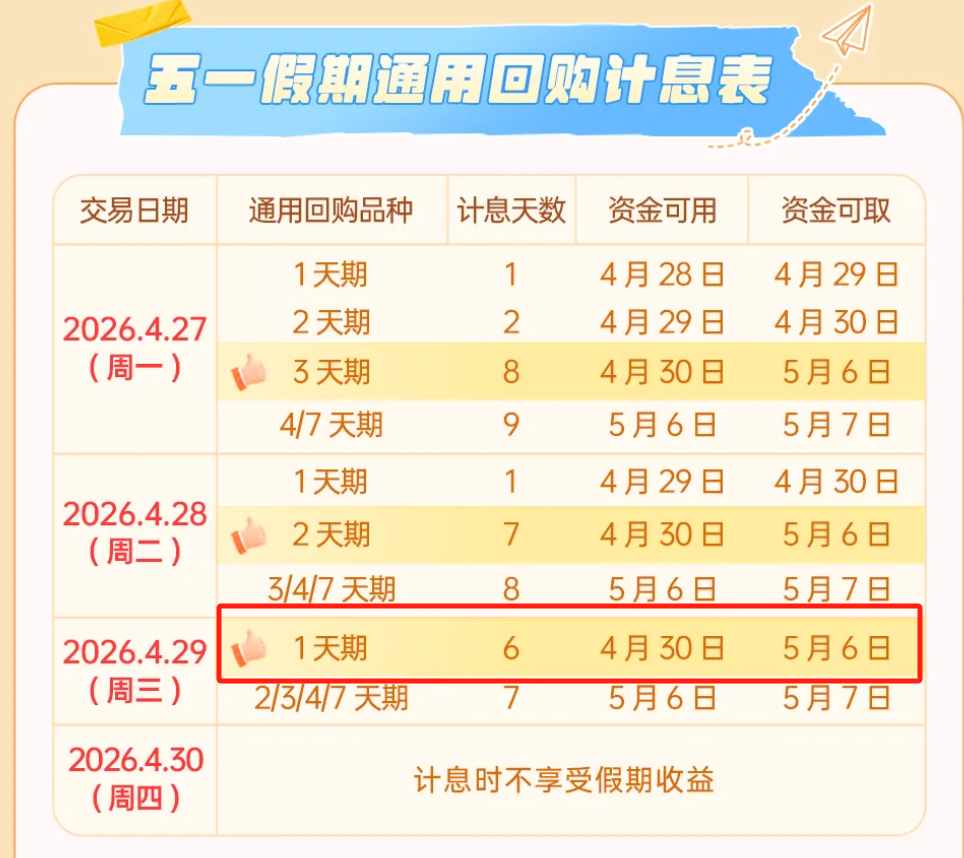4月29日(周三),投资者可以借出1天期通用回购(沪市逆回购简称GC001,代码204001;深市逆回购简称R-001,代码131810),就可以收获6天利息,资金在2026年5月6日盘前已可提现。