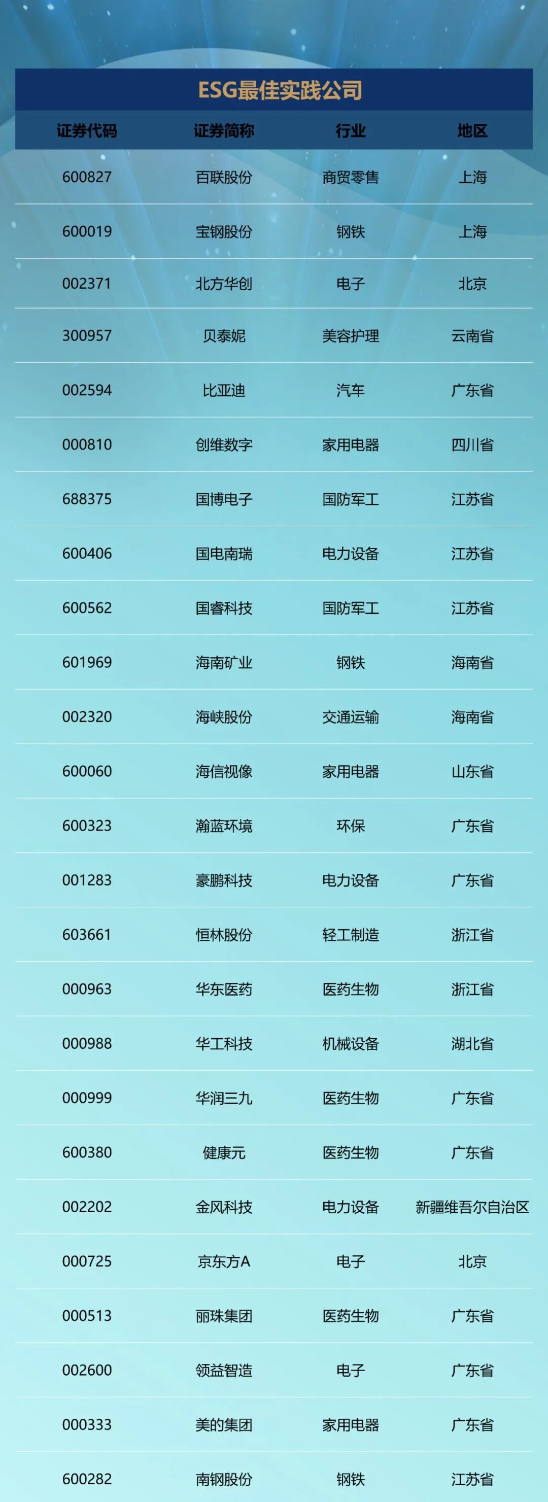 同时,《新财富》杂志综合信息披露质量、ESG相关指标、尽职调查及票选情况,遴选出50家在ESG实践方面具有领先示范作用的公司,以此助推上市公司引领绿色发展、履行社会责任、提升公司治理水平。