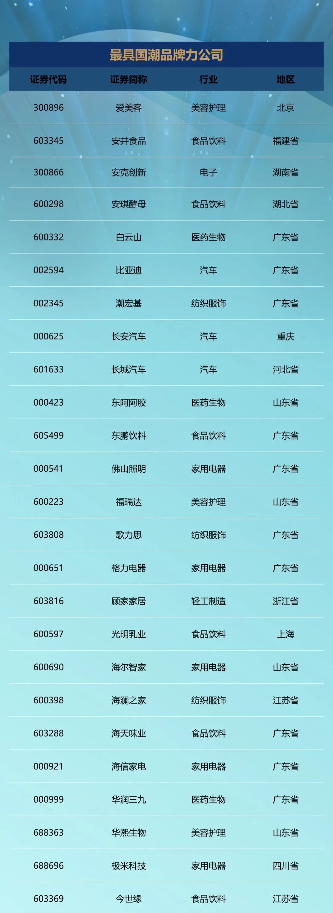 此外,为促进国潮品牌高质量发展,《新财富》杂志在京、沪、深三地上市的A股公司中,选取与消费者衣食住行相关的、服务个人消费者的生产型上市公司作为国潮品牌价值评价对象,根据企业的行业分类、财务数据等相关指标,结合信息披露质量、可持续发展(ESG)表现、品牌影响力、尽职调查及票选等方面的情况,综合筛选出50家“最具国潮品牌力公司”。本活动旨在挖掘在资本市场表现优秀、兼具品牌影响力的国潮品牌上市公司标杆,助推中国品牌走向海外。