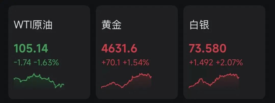 油价明显跳水。截至发稿,WTI原油报105.14美元/桶,跌幅为1.63%。