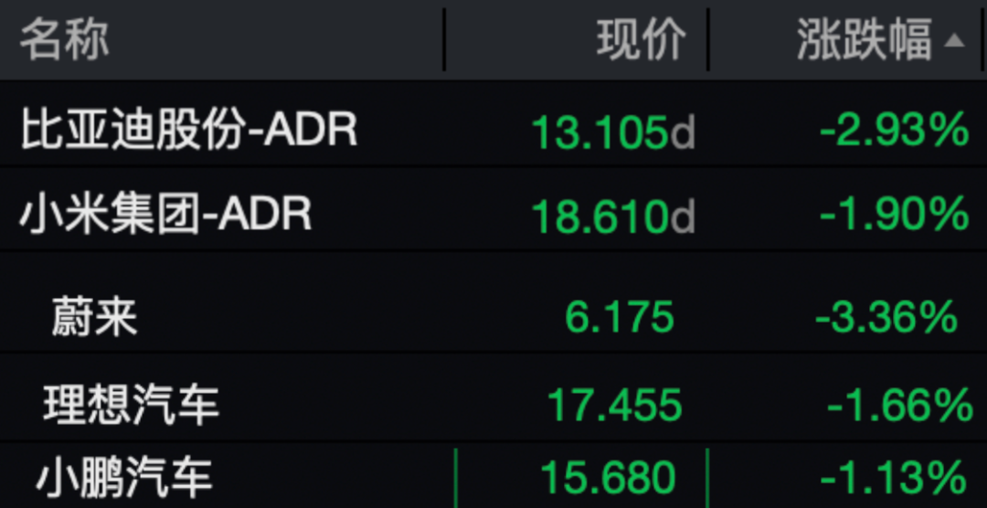 中概股方面,霸王茶姬、晶科能源涨超4%。新能源汽车股集体下跌,比亚迪跌近3%,蔚来跌超3%,小米集团、理想汽车、小鹏汽车均跌超1%。