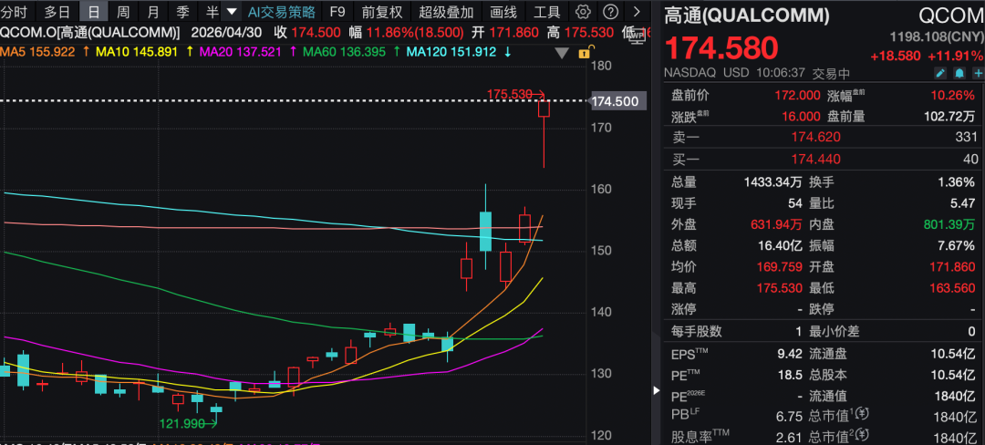 热门个股方面,高通涨近12%,其CEO预计智能手机市场将在第三财季后反弹。