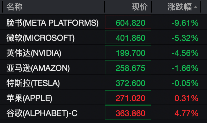 美国科技七巨头多数走低。脸书跌超9%,微软跌超5%,英伟达跌超4%。