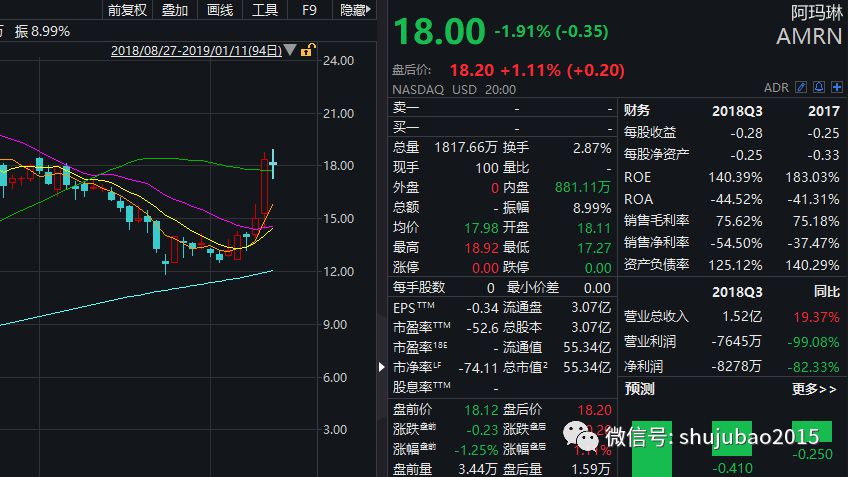 阿玛琳(Amarin)本周上涨36.36%,最新收盘价为18美元,该股在2018年累计上涨239.4%。在会议之前,该公司发布了一份保守的新心脏药物Vascepa销售展望,略低于分析师的预期。但投资者在该公司CEO约翰西罗的报告中看到了更加乐观的前景。