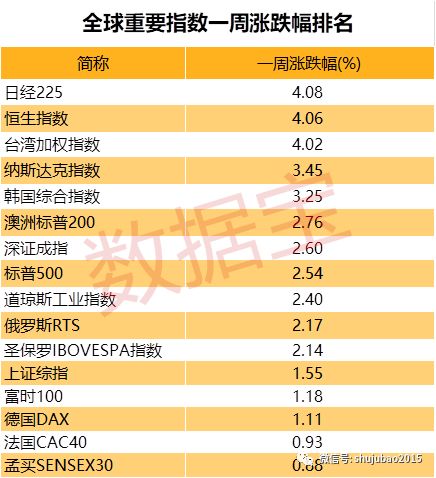 美国三大股指本周全线上涨;欧洲三大股指本周均小幅上涨;亚太股市本周普涨。